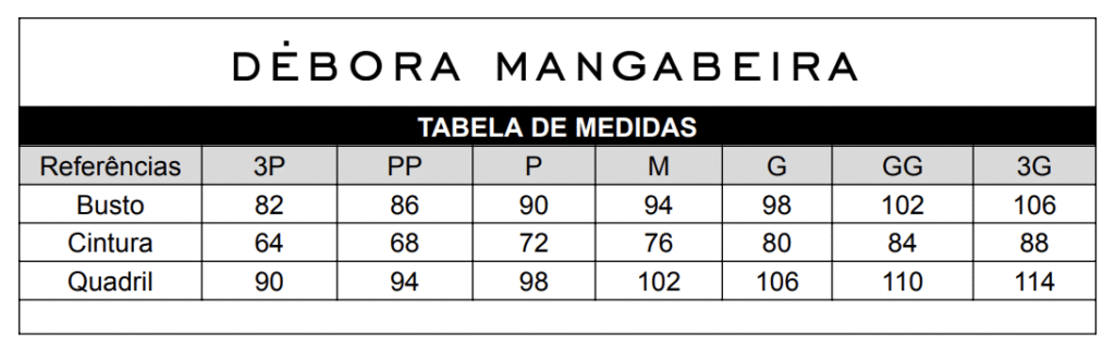 Todos os modelos do site podem ser encomendados nos tamanhos 3P, PP, P M, G, GG e 3G. A tabela de medidas fica disponível na descrição extra de todos os produtos.