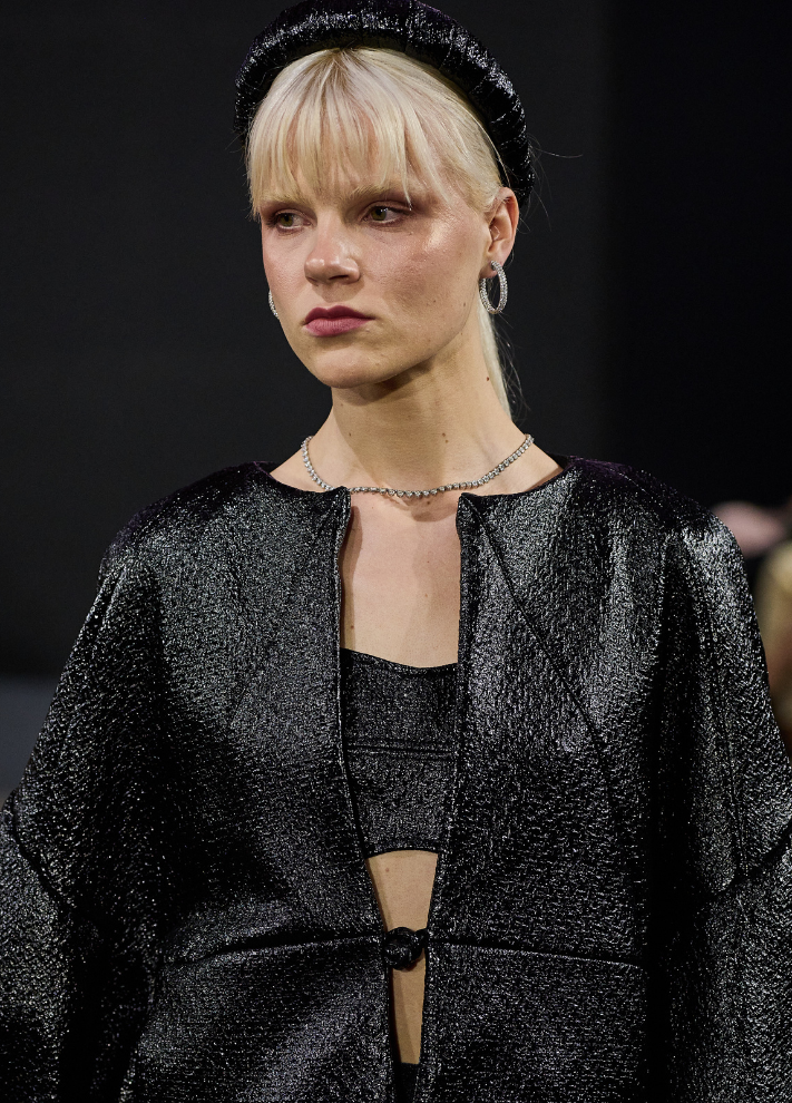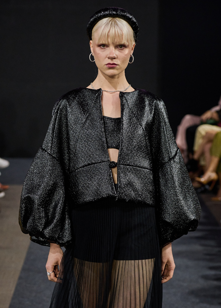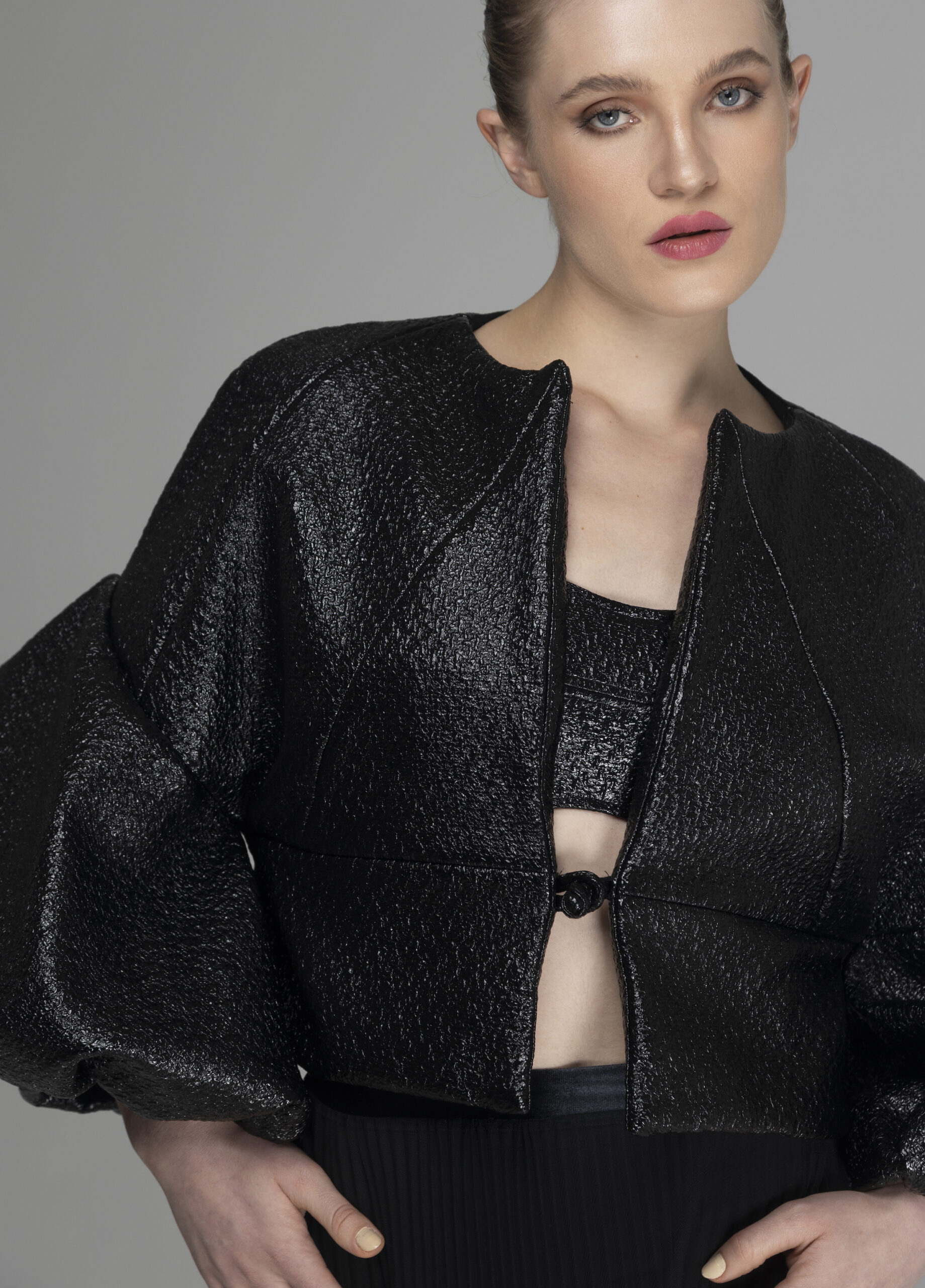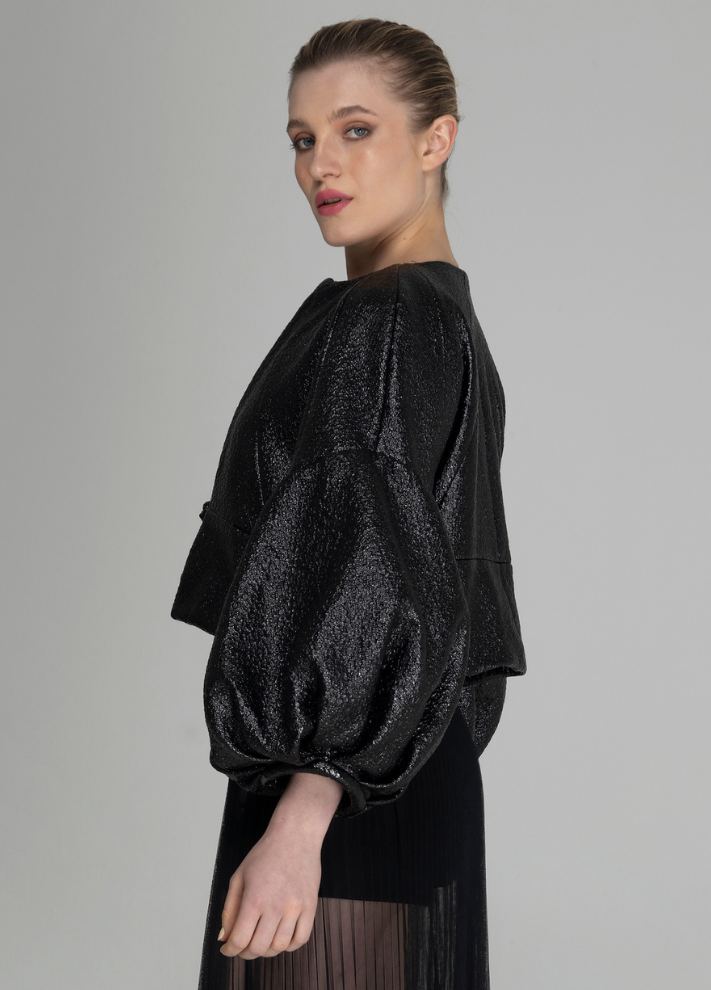 Casaco Ônix com mangas volumosas e bufantes, corpo mais solto e geometrizado.