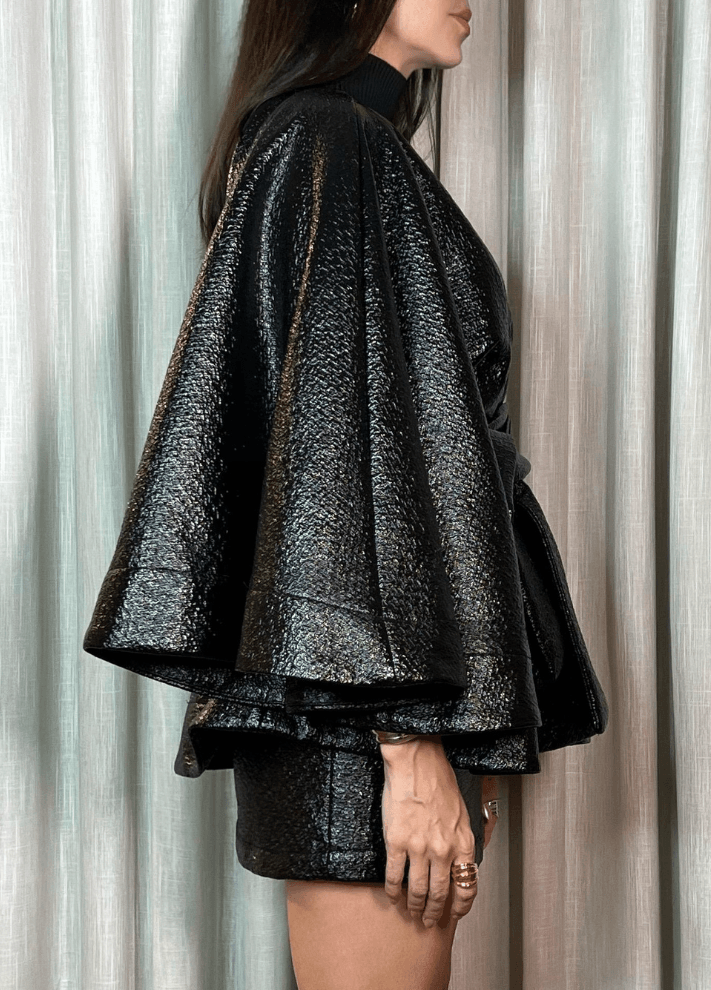 Casaco Peônia feito em tweed grosso preto, com mangas volumosas em godê e corpo estilo kimono. Acompanha um faixa avulsa larga para amarração.