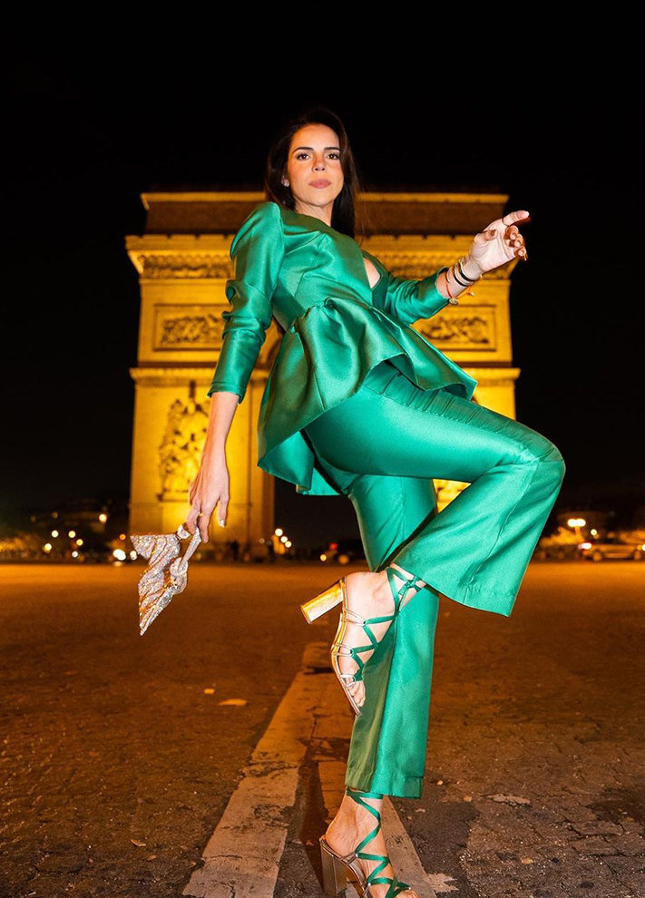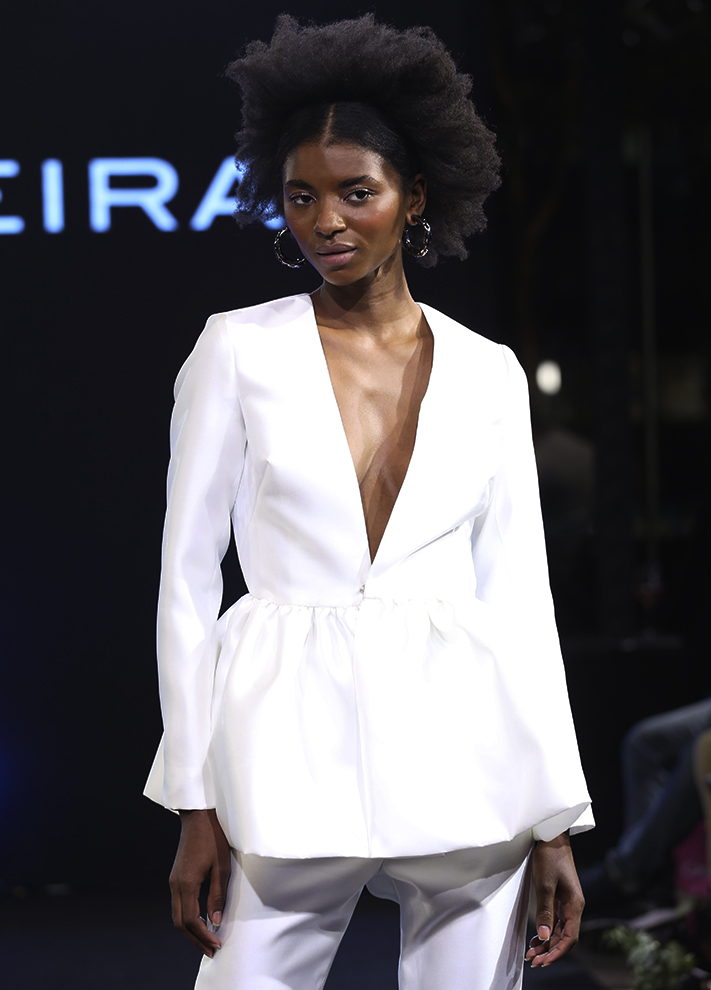 Conjunto Bonnie feito em zibeline composto por duas peças avulsas, um blazer com peplum franzido volumoso e decote V, com mangas longas retas, e uma calça estilo pantalona no comprimento mídi.