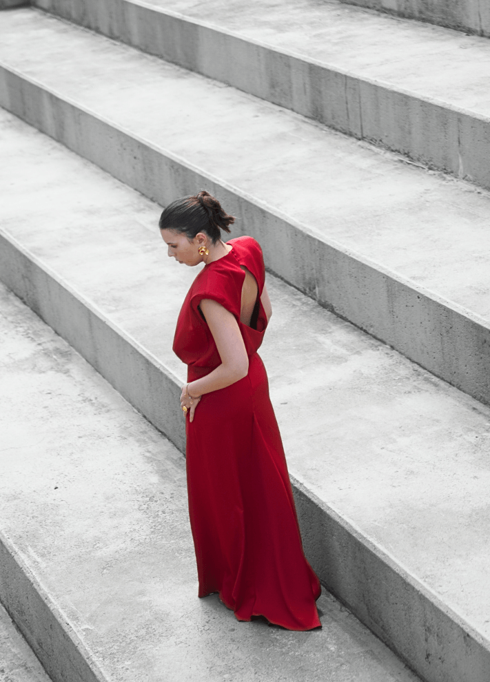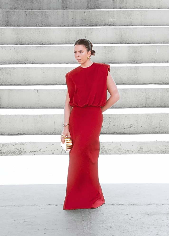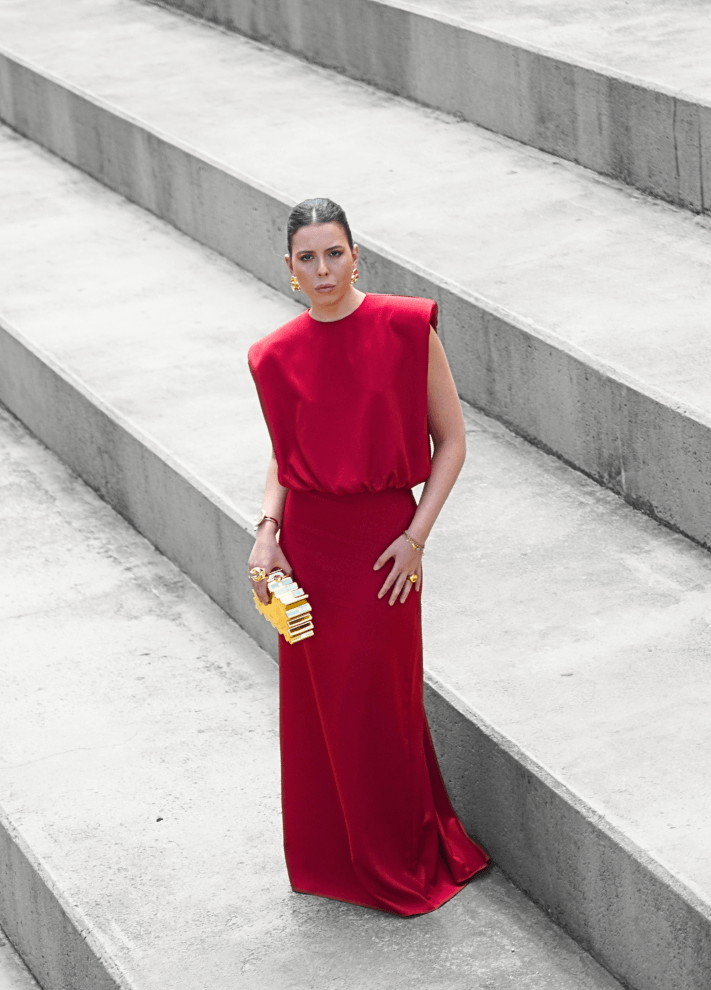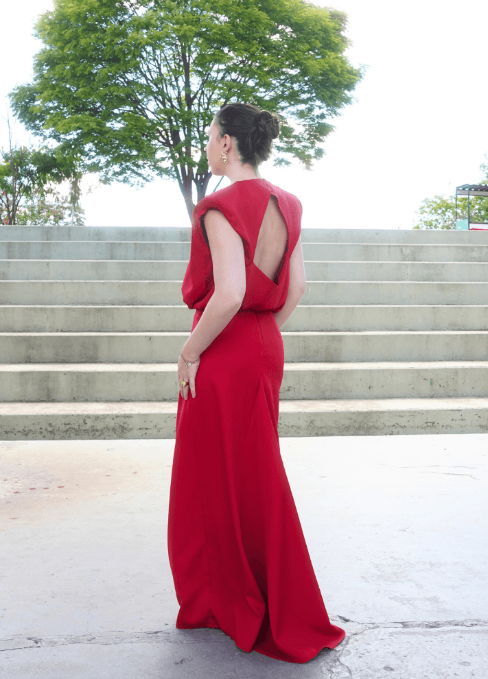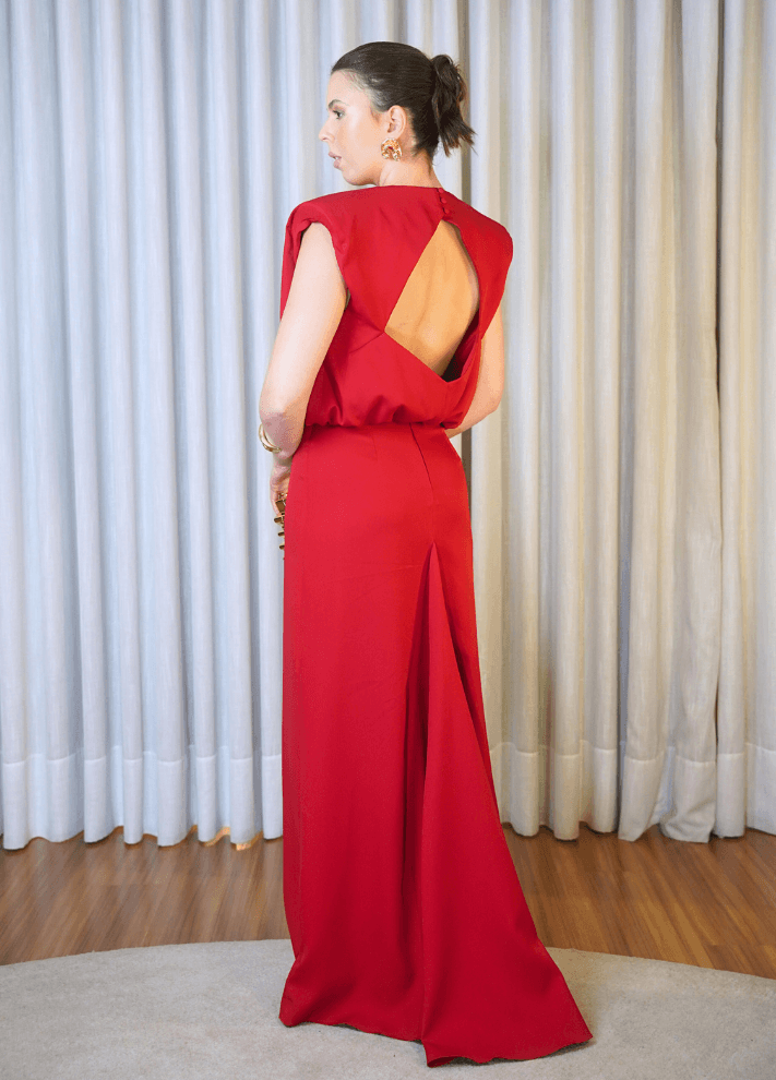 Conjunto Cinthia feito em crepe de gramatura alta, composto por uma saia reta com leve caudinha saindo do bumbum, e uma blusa geometrizada com ombreiras altas e costas abertas em forma de losango.