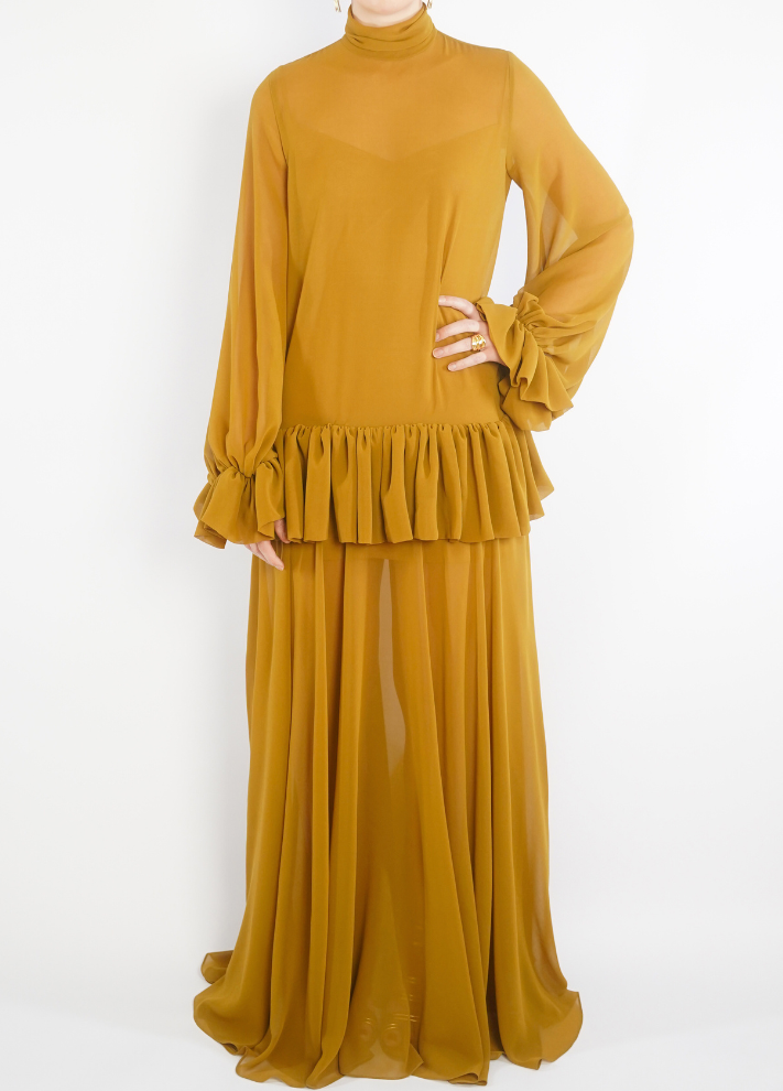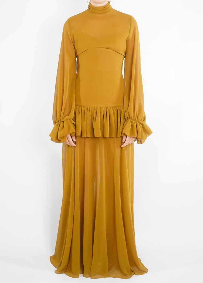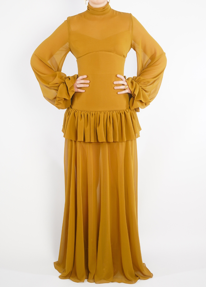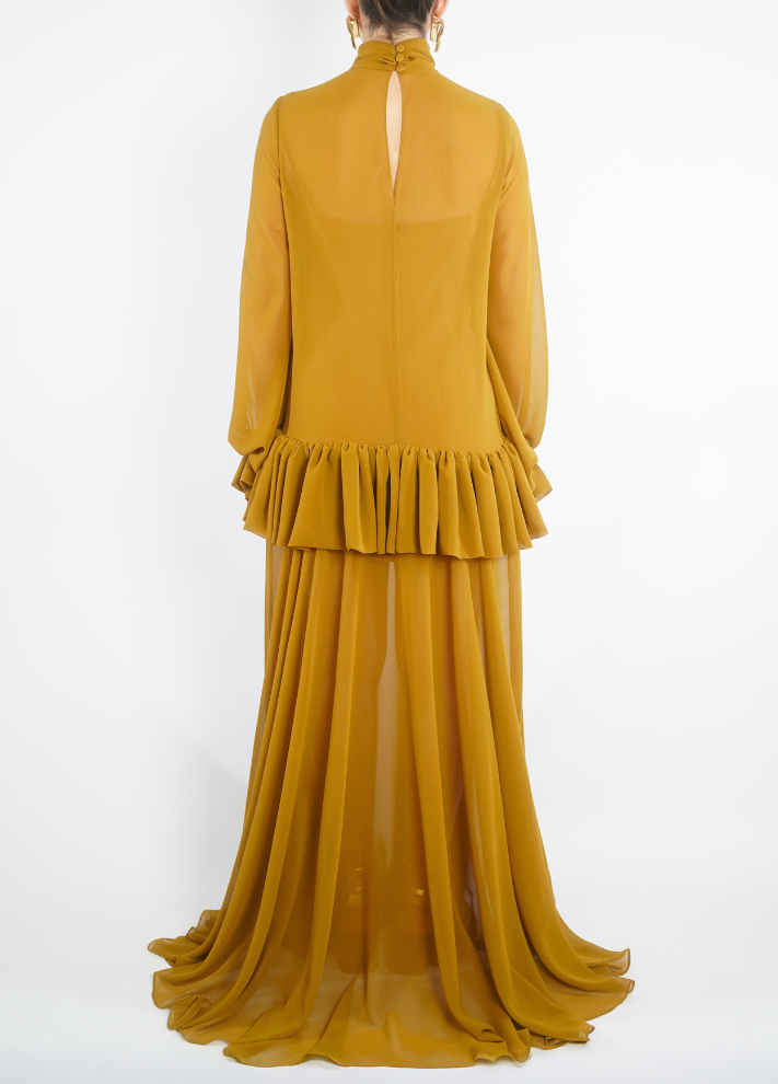 Vestido feito em chiffon, composto por uma veste longa, com corpo reto, mangas longas com babados na barra, gola alta com fechamento por meio de botões, babado saindo da altura do quadril e saia godê. Acompanha um corpete estruturado avulso com fechamento por meio de amarração nas costas.