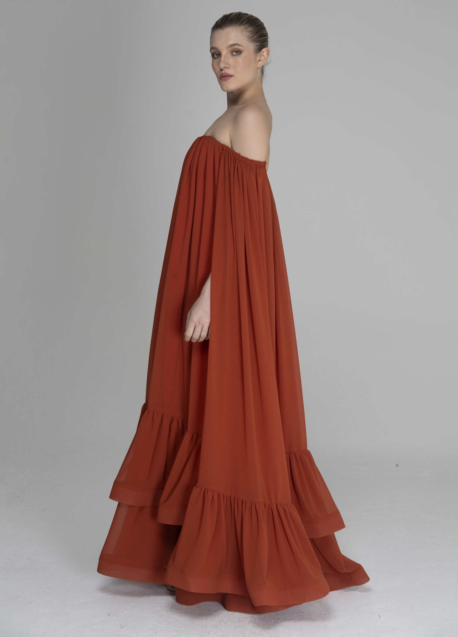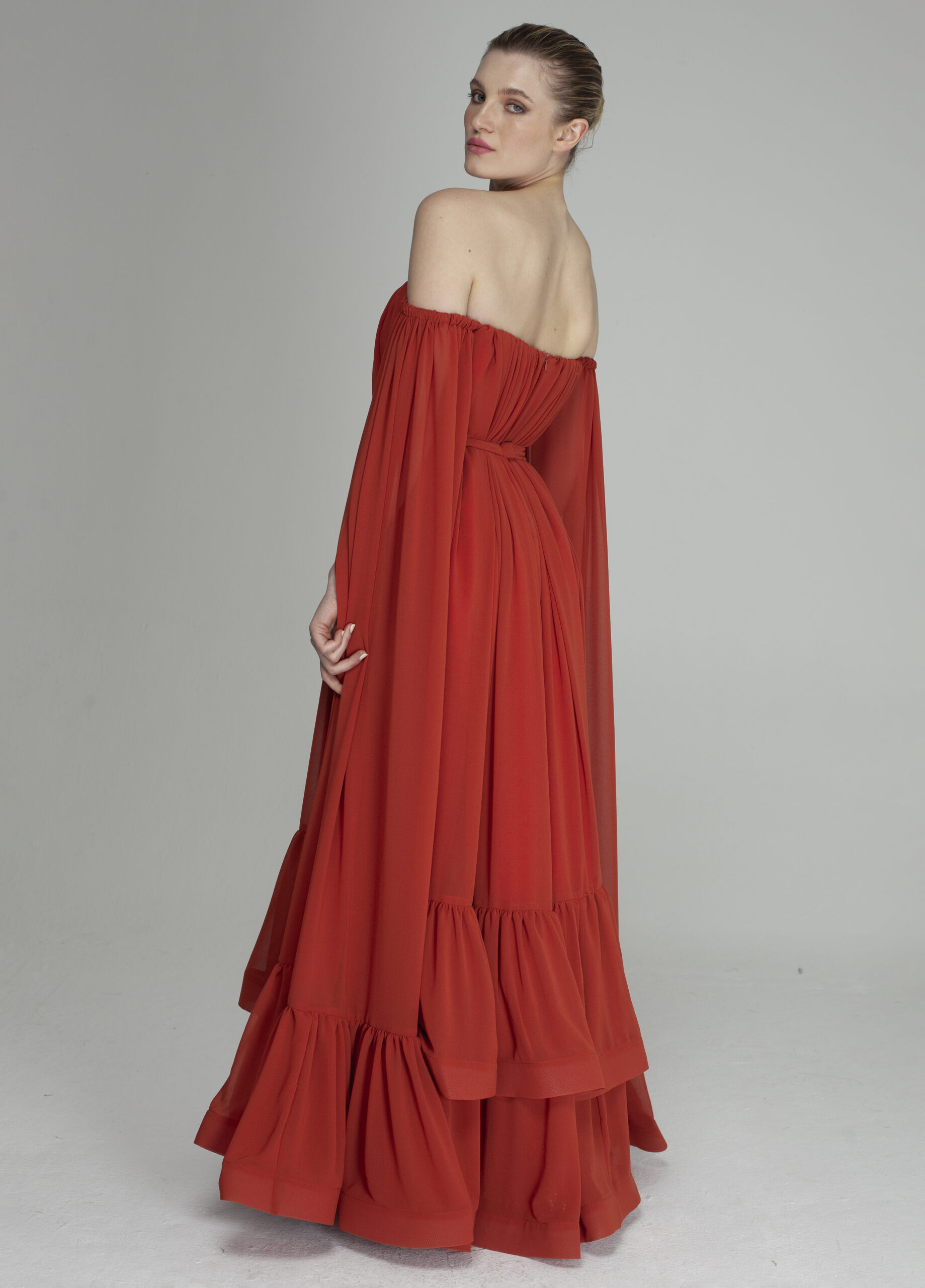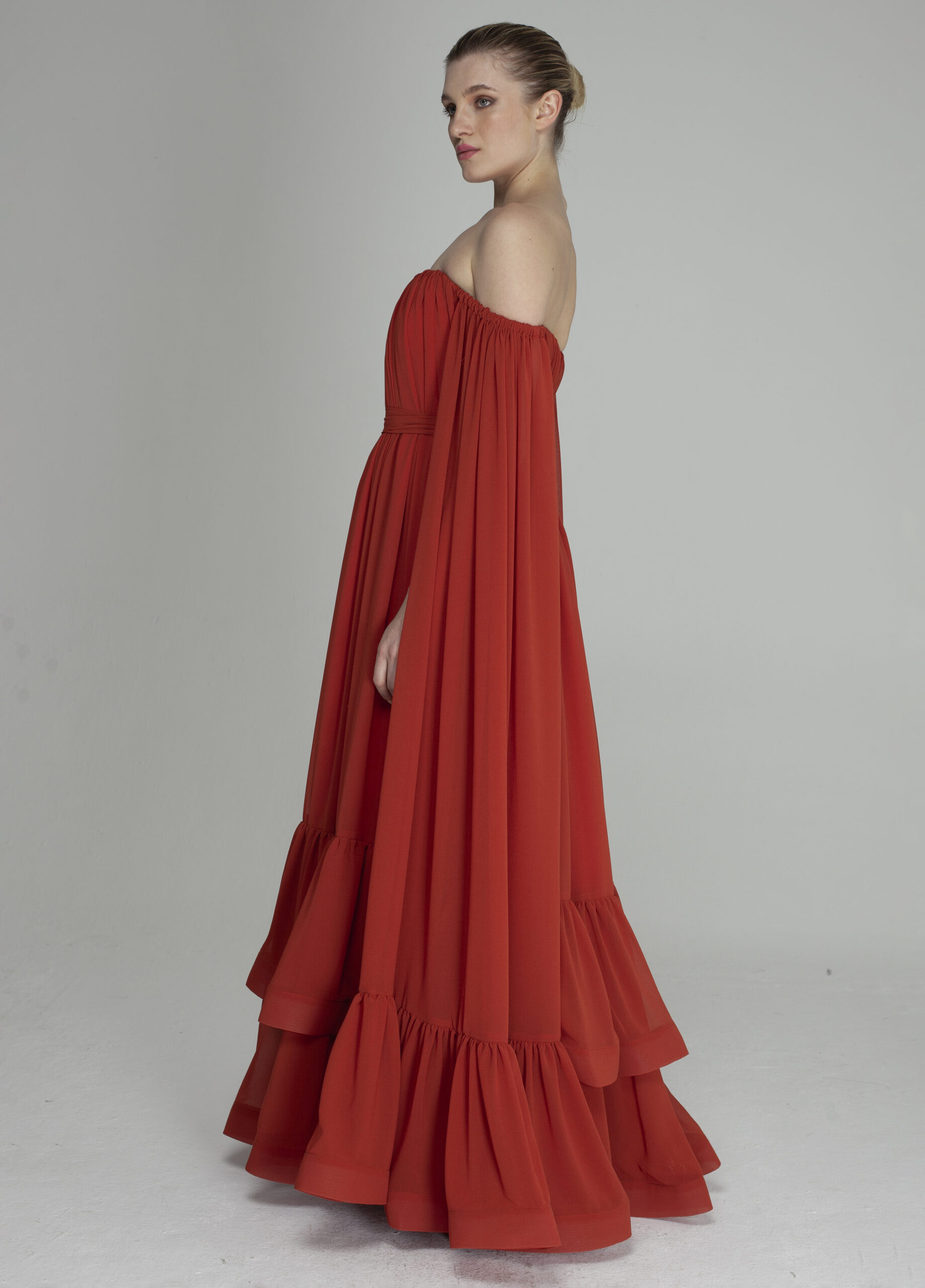 Vestido LR feito em chiffon, com modelo ombro a ombro, corte interno para sustentação com amarração cruzada nas costas, modelagem ampla, com bastante volume e franzido, duas camadas de babados franzidos na barra com crinol, e manga com elástico e babado na barra com crinol. Acompanha uma faixa avulsa para acinturar.