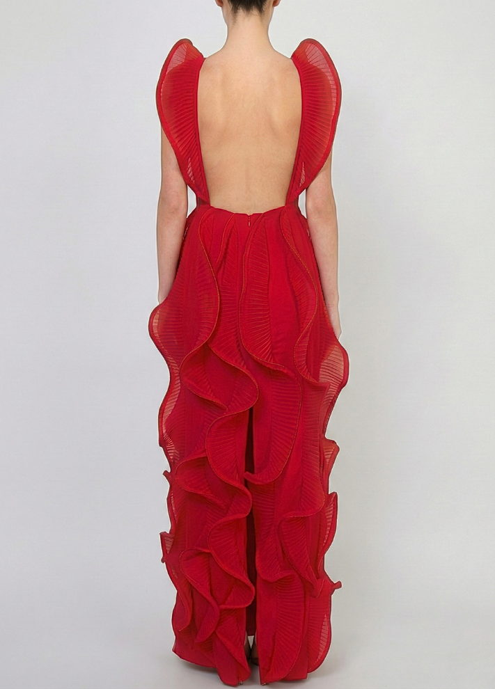 Vestido Lucy longo feito em chiffon, com decote estilo frente única, aberto nas costas, cava lateral bem aberta, detalhes plissados com crinol, criando um volume ondulado, tanto no decote das costas como em toda a saia. Possui fenda nas costas. Fechamento por meio de zíper.