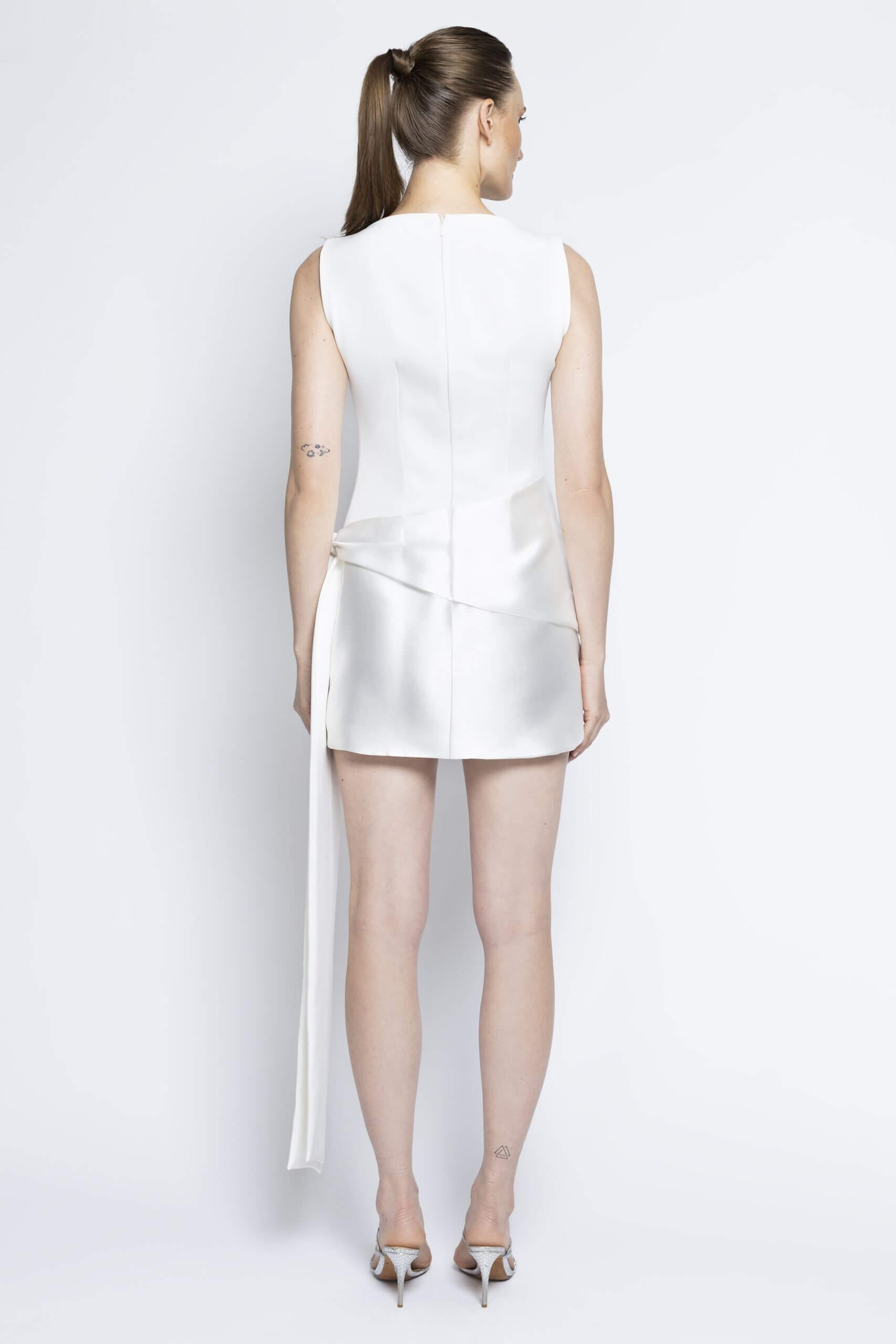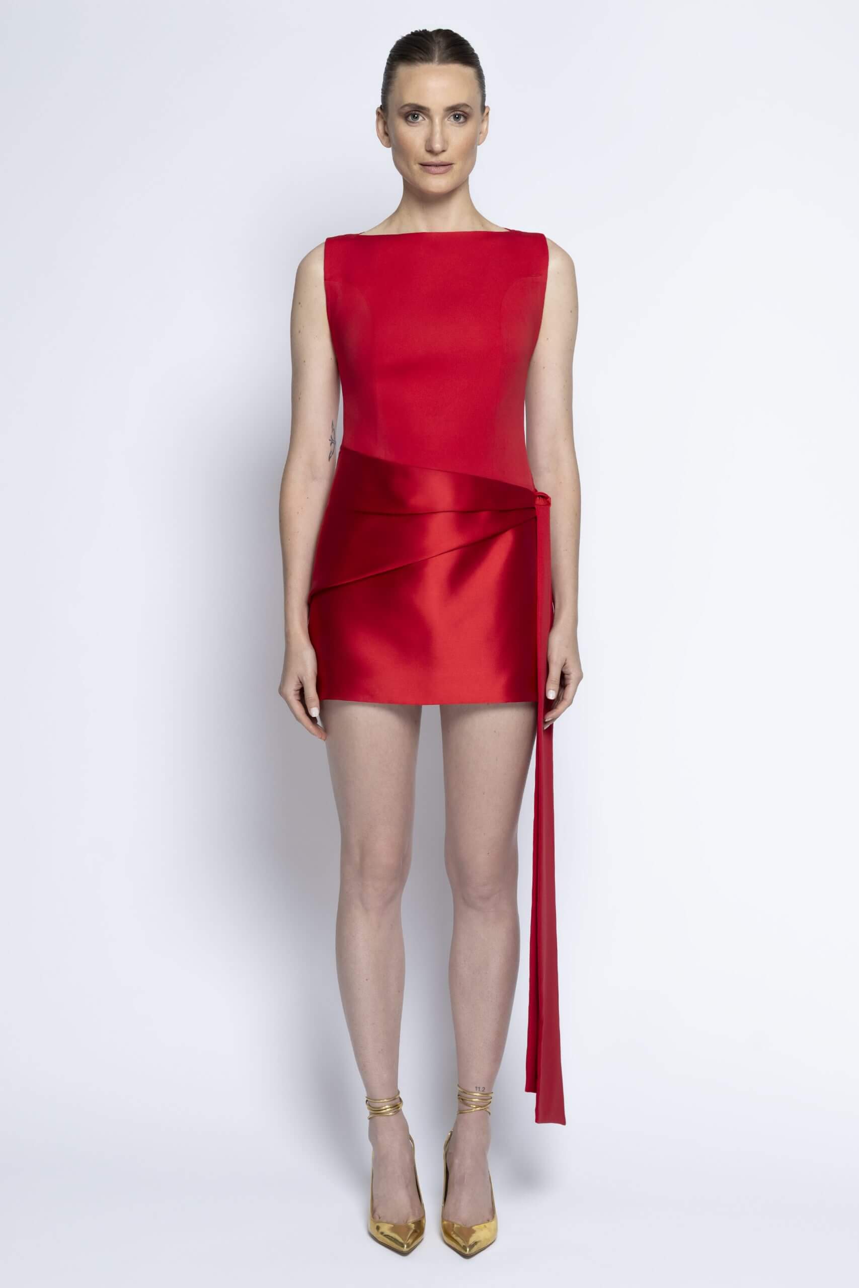 O Vestido Manhatan é feito em dois tecidos diferentes na mesma tonalidade. O busto é feito em crepe de gramatura alta com elastano, decote canoa, cava reta e levemente rebaixada na lateral, e pence princesa. A saia é feita em zibeline com uma camada sobreposta diagonalizada finalizando numa amarração lateral com pontas longas. Fechamento por meio de zíper no centro costas.