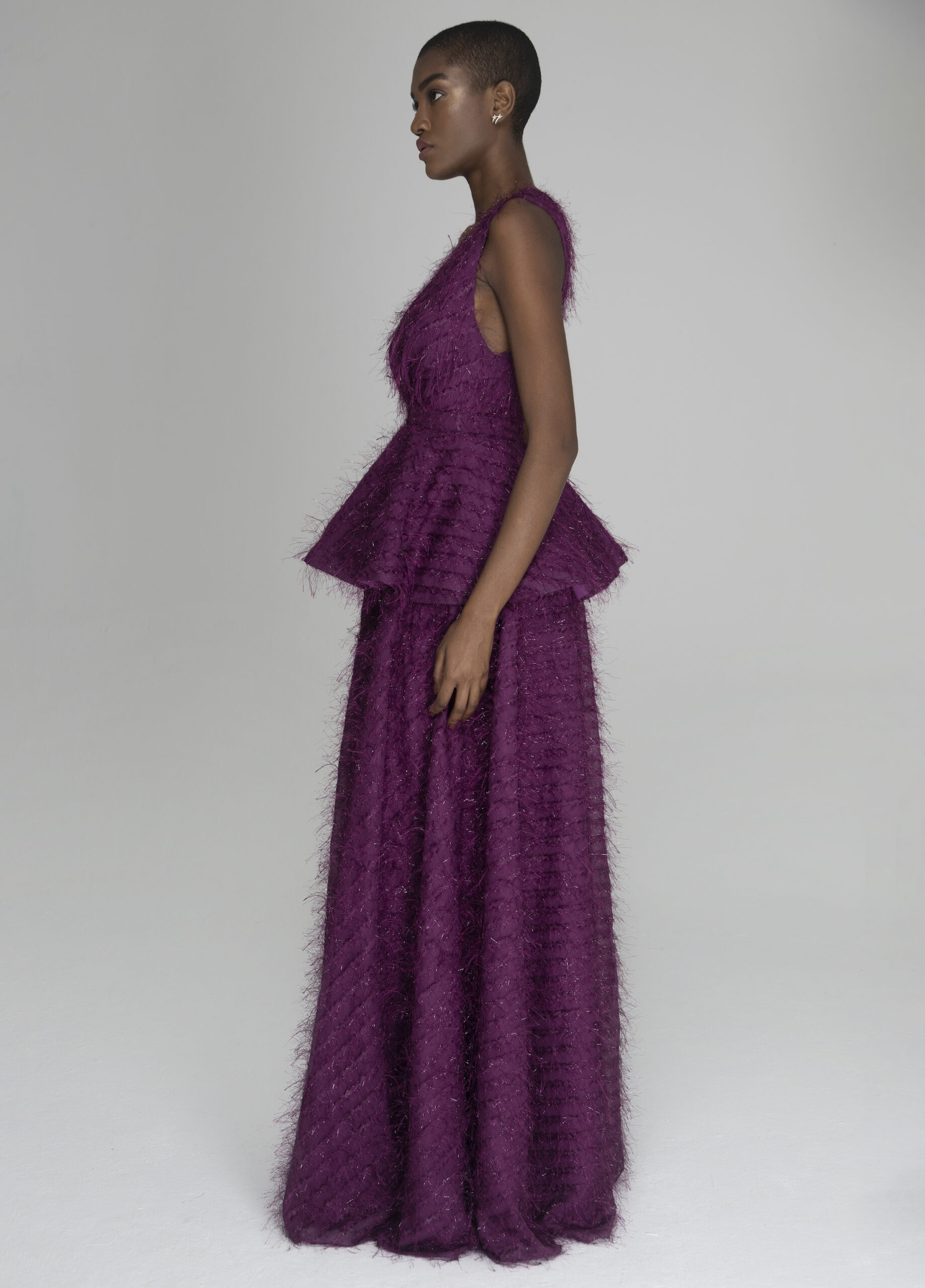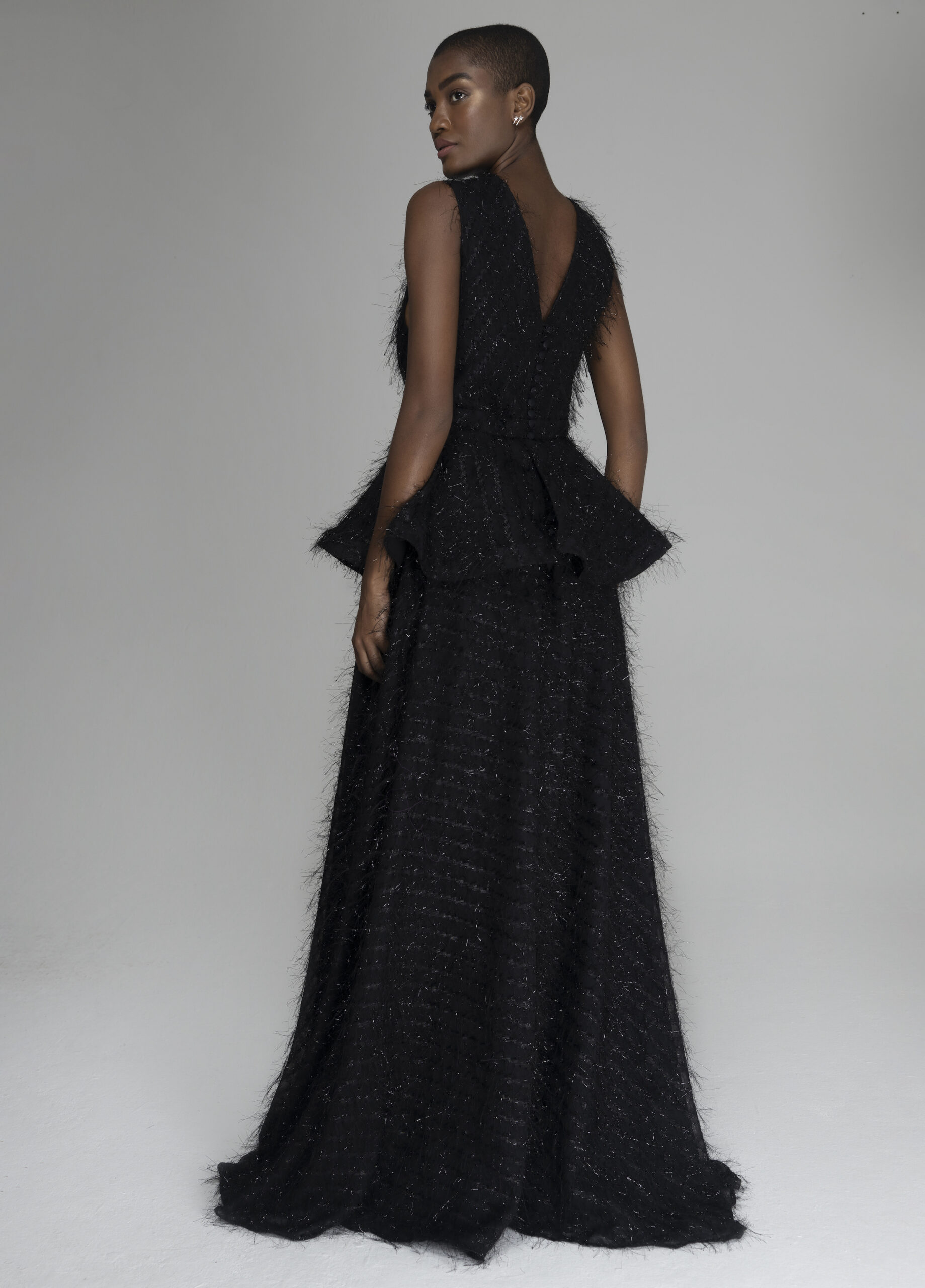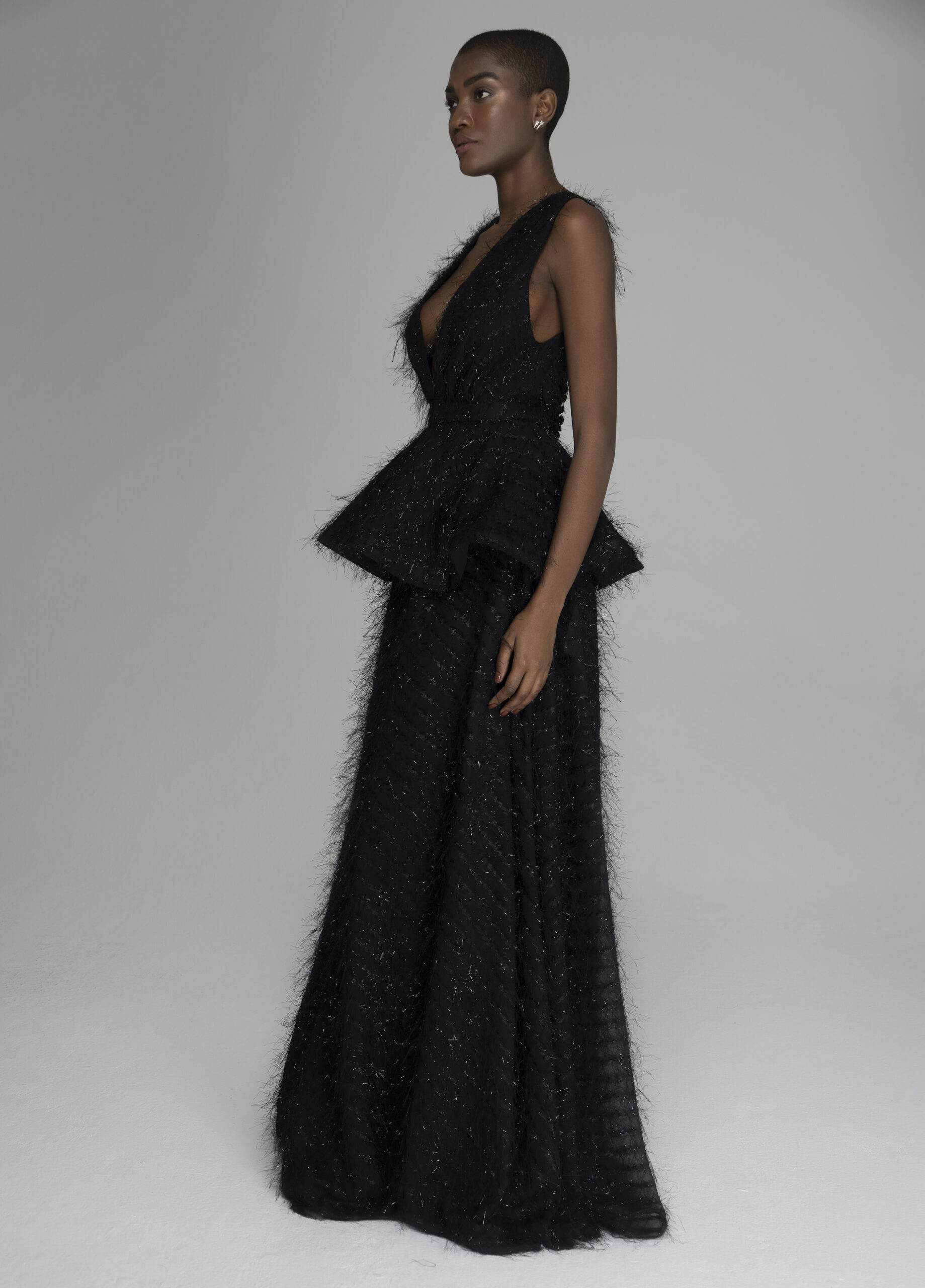 Vestido Morganita feito em chiffon transparente com plumas, com uma base de crepe, com o decote em V, peplum pregueado com crinol na barra, e saia godê rodada.