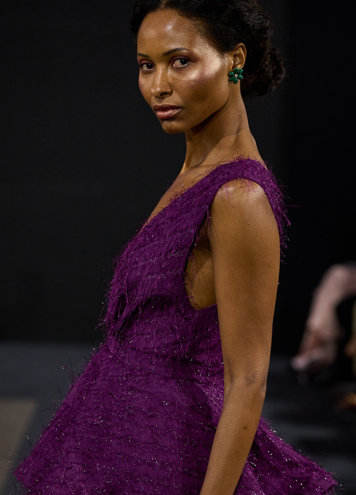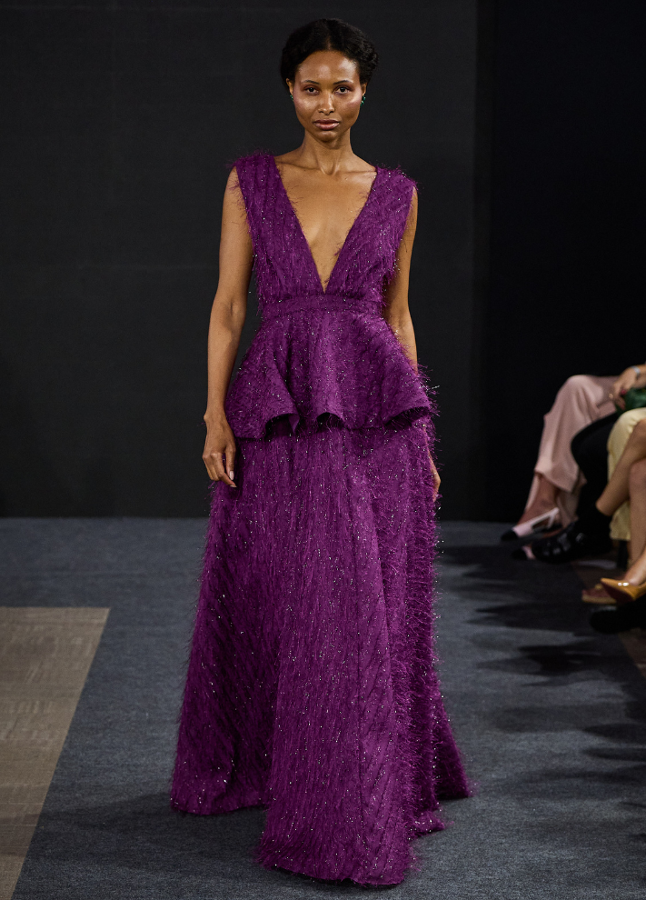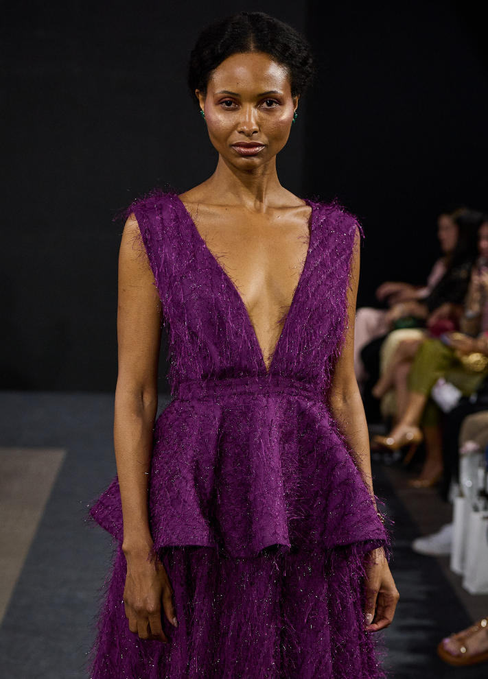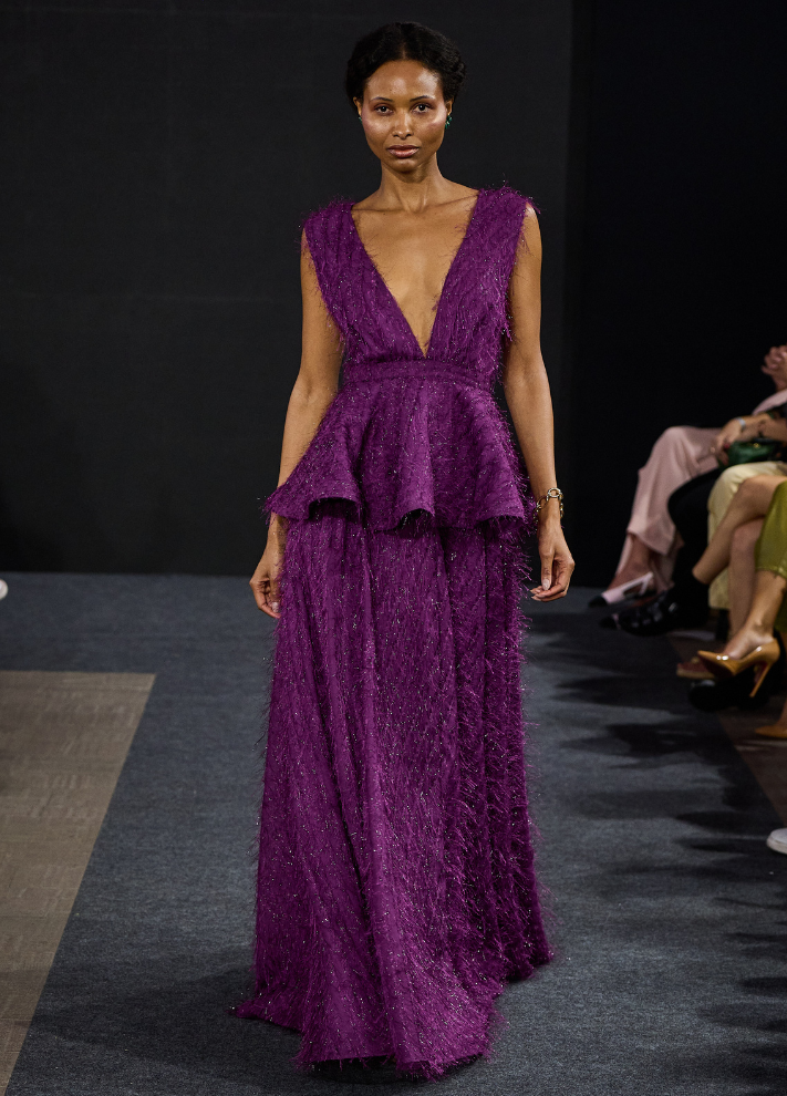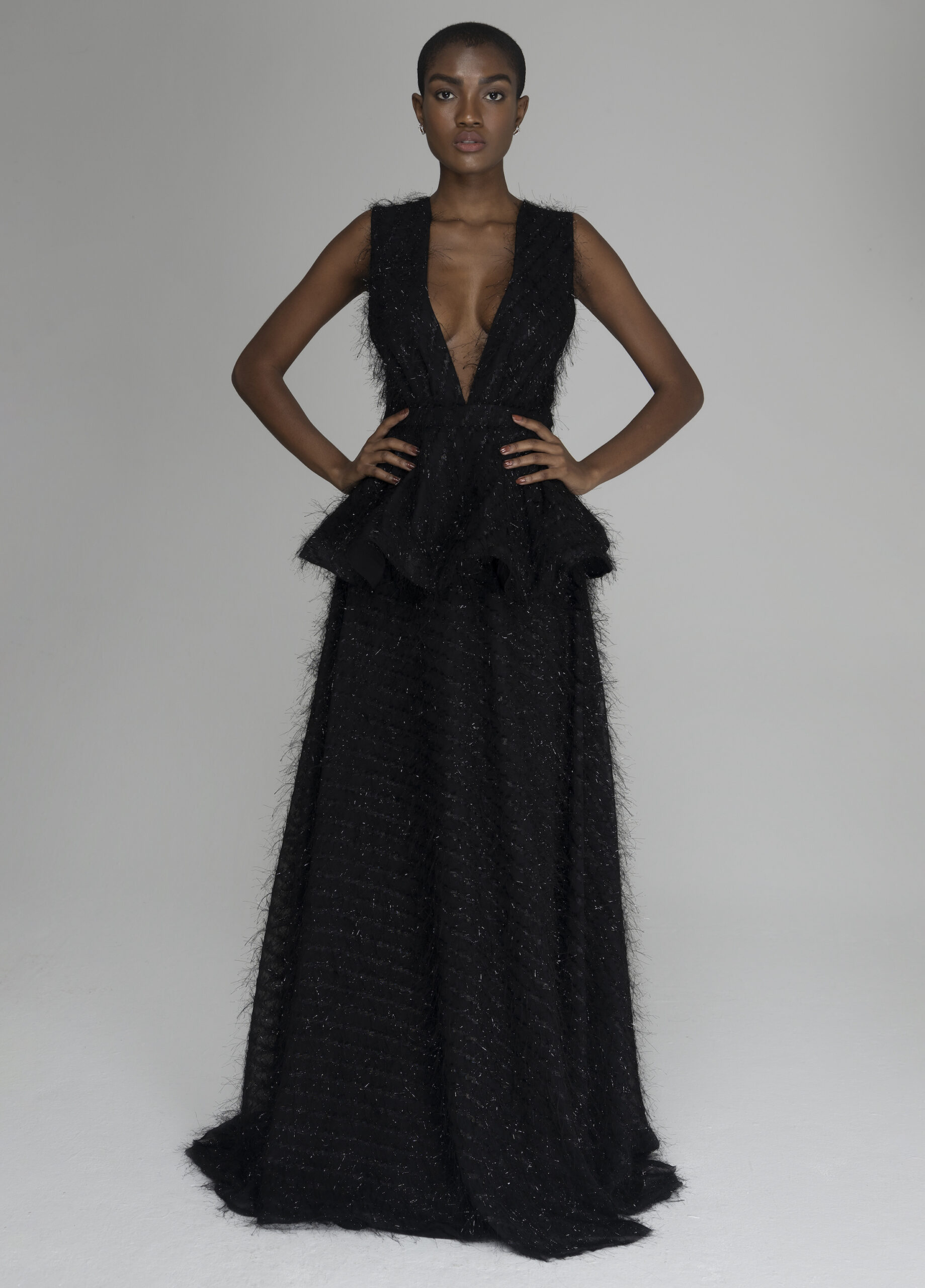 Vestido Morganita feito em chiffon transparente com plumas, com uma base de crepe, com o decote em V, peplum pregueado com crinol na barra, e saia godê rodada.